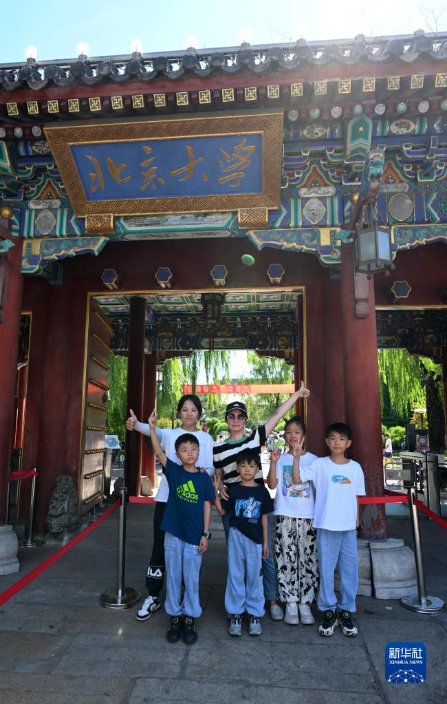 7月8日,来自广东深圳的游客在北京大学西门留影。