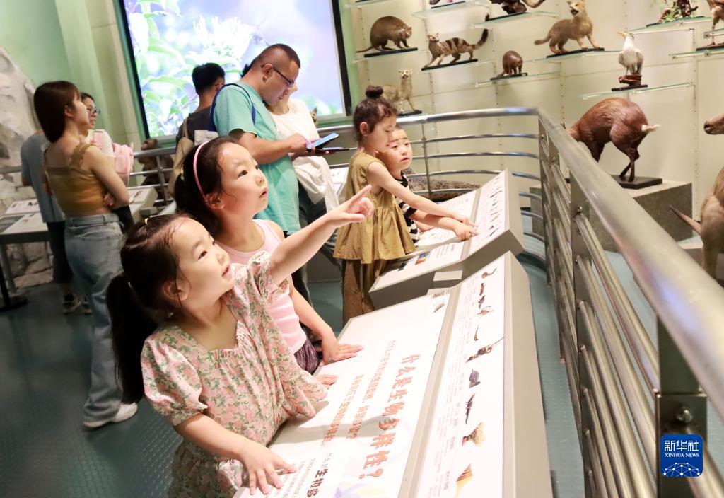 7月8日,小观众在江苏常州博物馆参观动物标本。