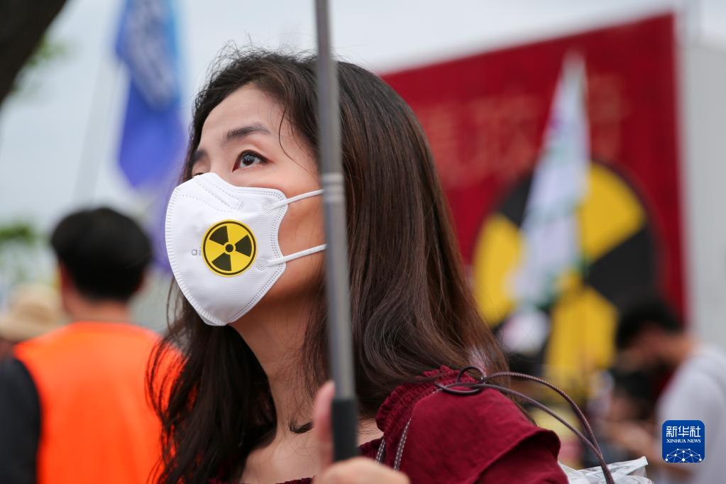 7月8日,在韩国首尔,一位女士戴着贴有核辐射标志的口罩参加反对日本核污染水排海的集会。 新华社记者 王益亮 摄