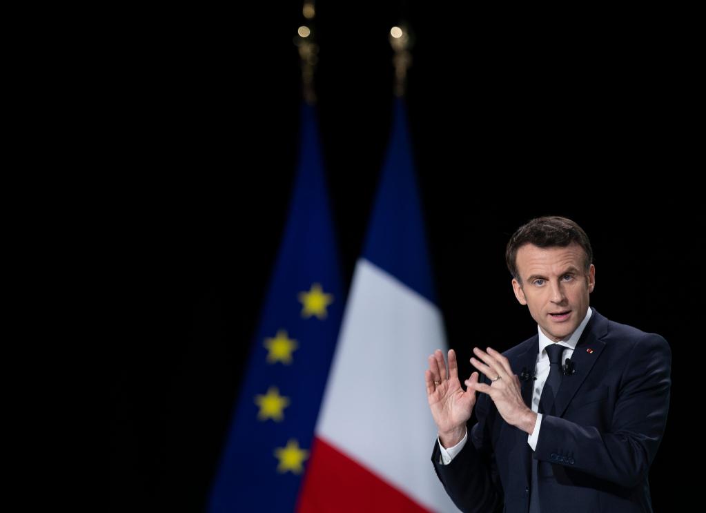 2022年3月17日,法国总统马克龙在巴黎北郊塞纳-圣但尼省举行的新闻发布会上介绍竞选纲领。新华社发(肖恩·洛朗摄)