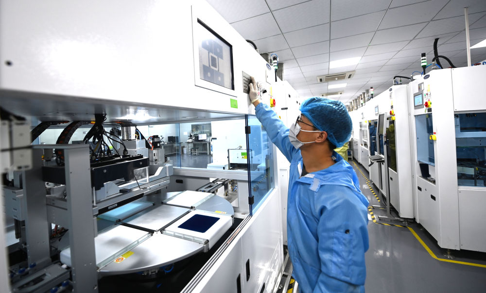 在杭州市富阳区春江街道富春湾新城的杭州正银电子材料有限公司的研发实验室内,自动化设备在进行光伏板的丝网印刷(3月22日摄)。新华社记者 徐昱 摄