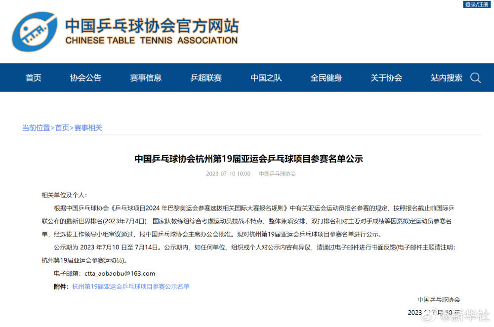 7月10日,中国乒乓球协会公示杭州第19届亚运会乒乓球项目参赛名单: