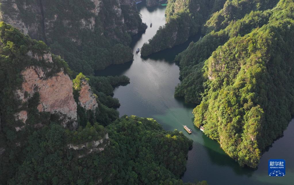 7月10日,游客乘船游览张家界宝峰湖景区(无人机照片)。