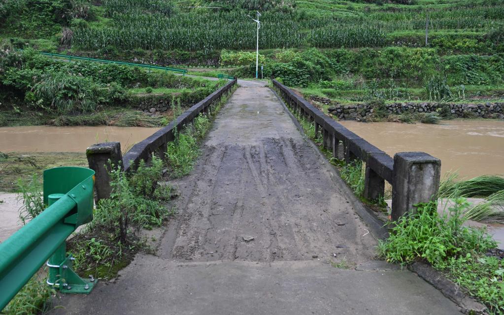 7月8日晚,在安徽省安庆市太湖县牛镇镇,汹涌的店前河水开始逐渐回落,至10日上午,水位已经回归正常。在同义村王屋组,连接店前河两岸的石桥上还留有洪水漫桥时携带的泥沙。