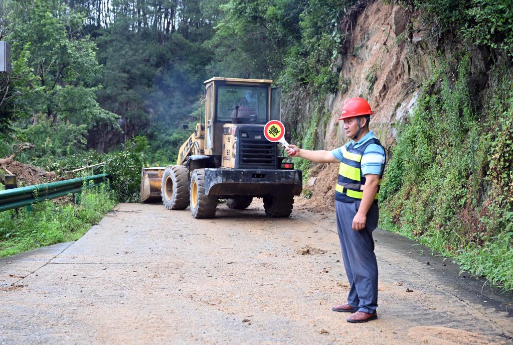 7月9日,在太湖县牛镇镇天桥村天天公路一段山体垮塌处,王和松示意车辆暂停通过。新华社记者周牧 摄