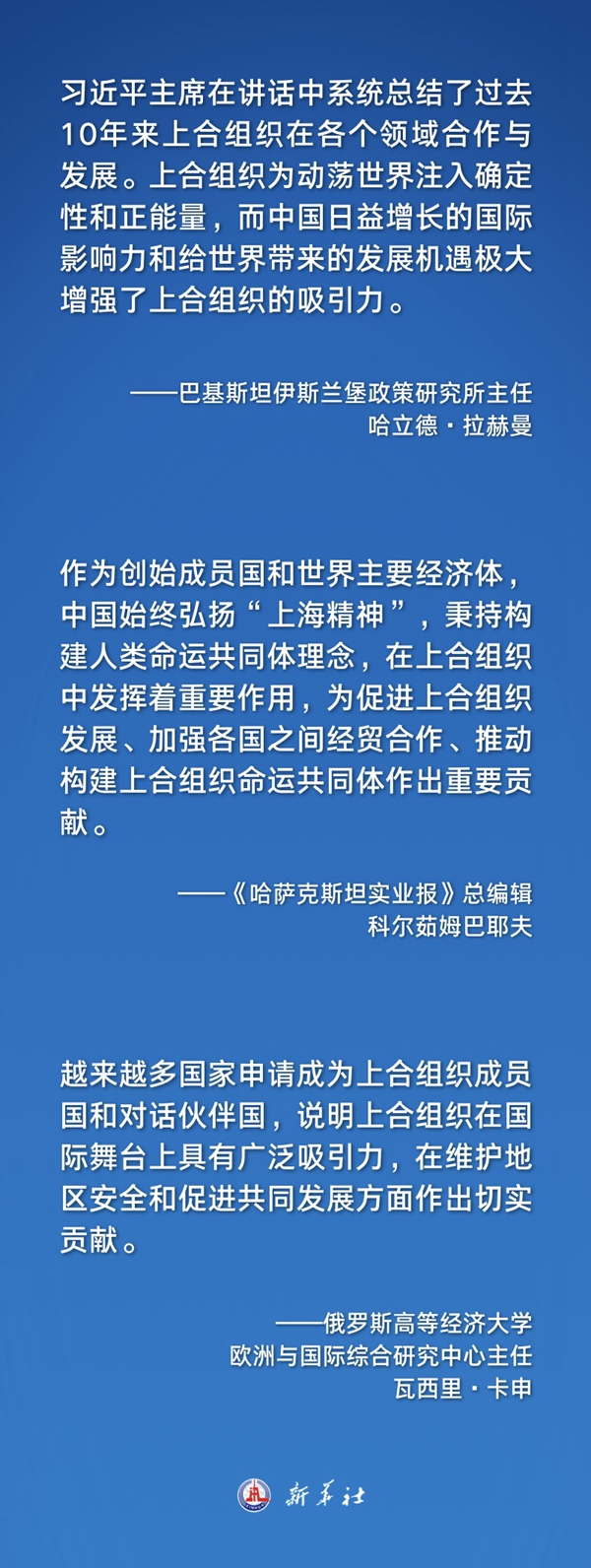 巴基斯坦伊斯兰堡政策研究所主任哈立德·拉赫曼说,习近平主席在讲话中系统总结了过去10年来上合组织在各个领域合作与发展。上合组织为动荡世界注入确定性和正能量,而中国日益增长的国际影响力和给世界带来的发展机遇极大增强了上合组织的吸引力。