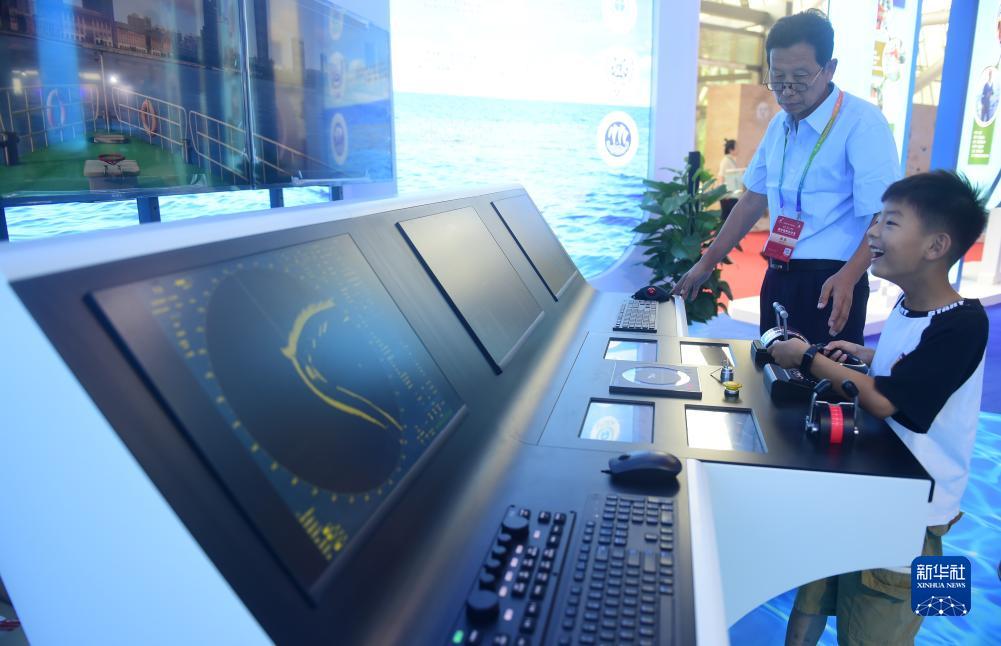 7月11日,小朋友在河北沧州举行的2023年航海科技博览会上模拟操作轮船。