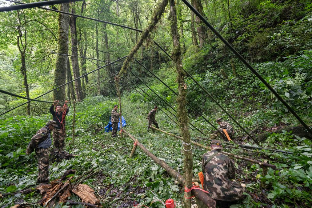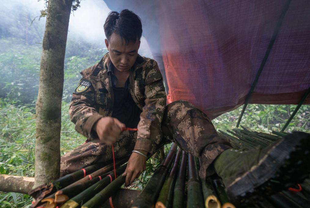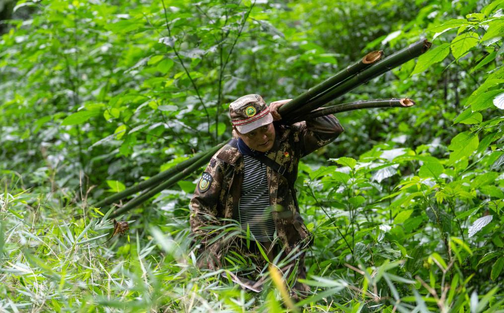 7月8日,巡护队员张全运送砍下来的竹子准备搭棚子。