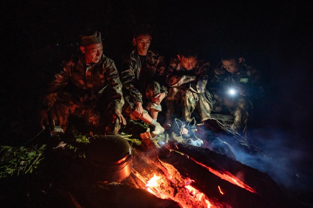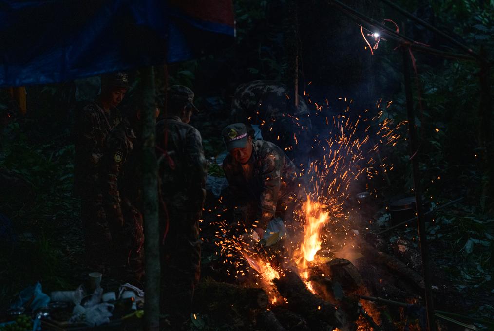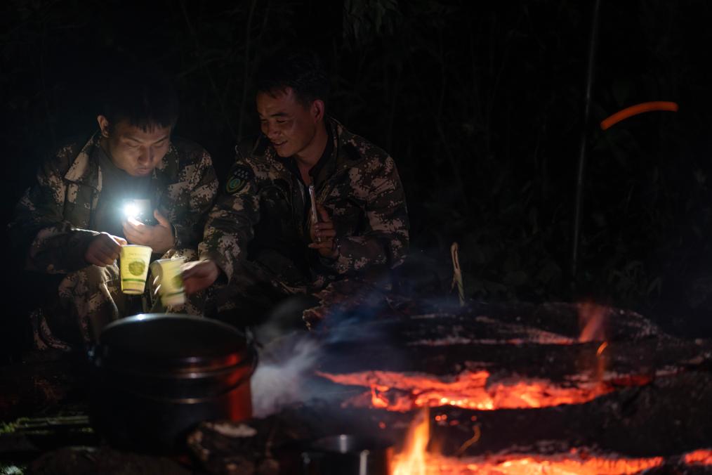 7月8日,巡护队员围在篝火旁做饭并烤干全身的湿衣服。