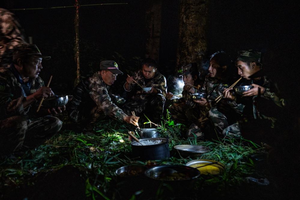 “飞鼠”的出现,让大家激动起来。随后,巡护队员迅速把从山下背上来的食材制作成土豆鸡汤和辣椒炒肉,分装在四个大盆里。大家一起蹲在地上,一扫而光。