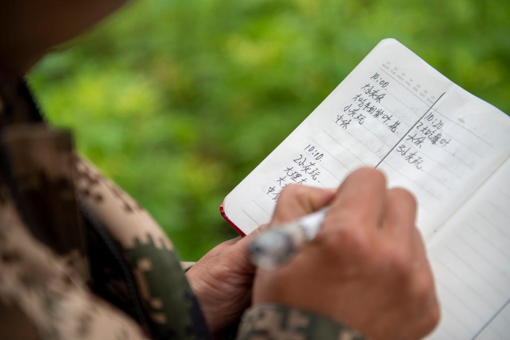7月8日,在高黎贡山国家级自然保护区,一名巡护队员在本上简单记录下观察到的猴群活动信息。