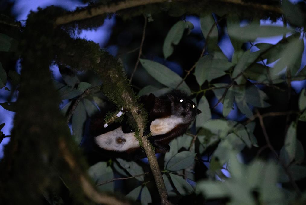 累得全身瘫软的记者也从“竹床”上一跃而起,跑出帐篷仰头望去,只见一只小猫大小的动物正紧紧抓住一根离地20米左右的树枝向下张望,两只眼睛在夜色中仿佛小灯泡一样闪闪发光。