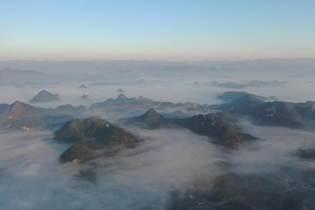 湖南省湘西土家族苗族自治州花垣县边城镇云海景观,边城在云雾笼罩下,宛如仙境。