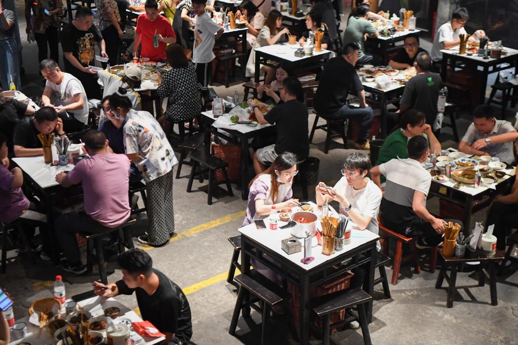 食客在长沙“超级文和友”品尝小龙虾等美食。