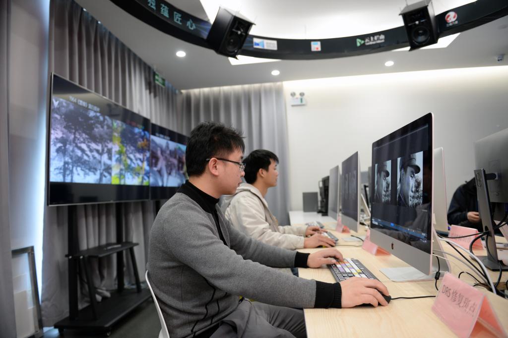 工作人员在长沙马栏山视频文创产业园做修复电影的工作。