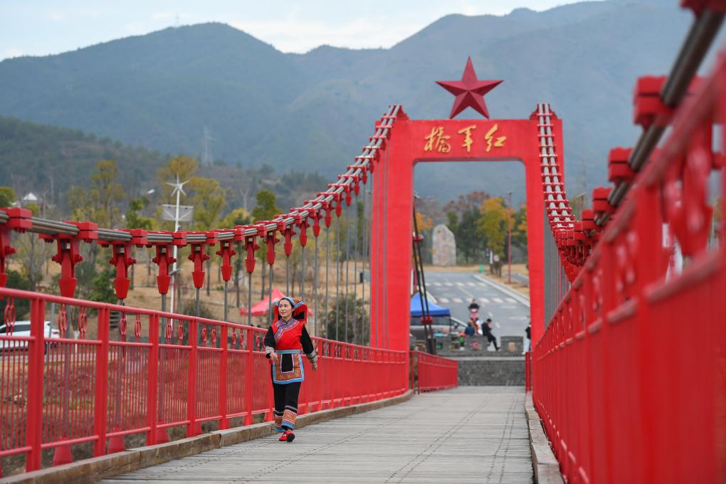 返乡创业青年朱梦嘉走在“半条被子村”湖南汝城沙洲瑶族村的红军桥上。