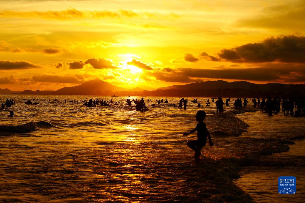 7月11日,家长带着孩子在海南省三亚市三亚湾戏水消暑。