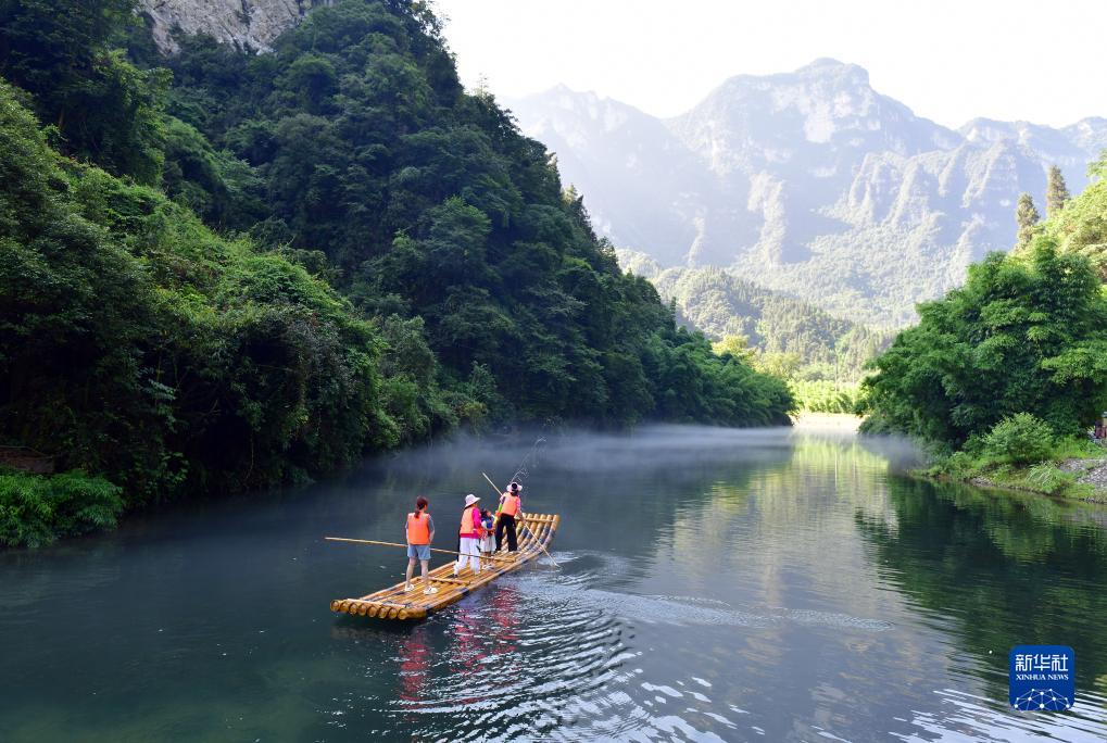 7月11日,游客在湖北省宜昌市秭归县三峡竹海生态景区体验竹筏戏水项目。
