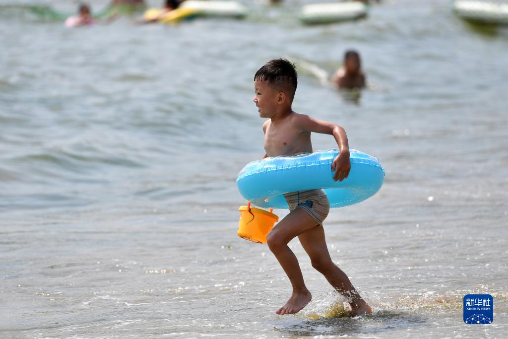 7月11日,一名小朋友在山东省青岛市第一海水浴场戏水。