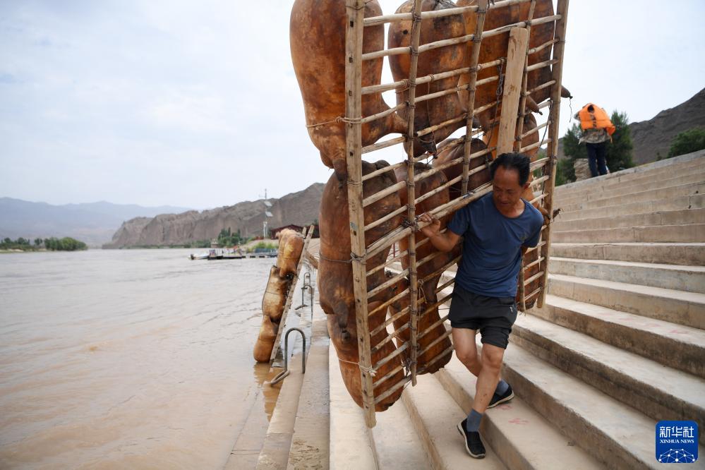 一名筏子客在黄河石林景区背着羊皮筏子准备漂流(7月11日摄)。