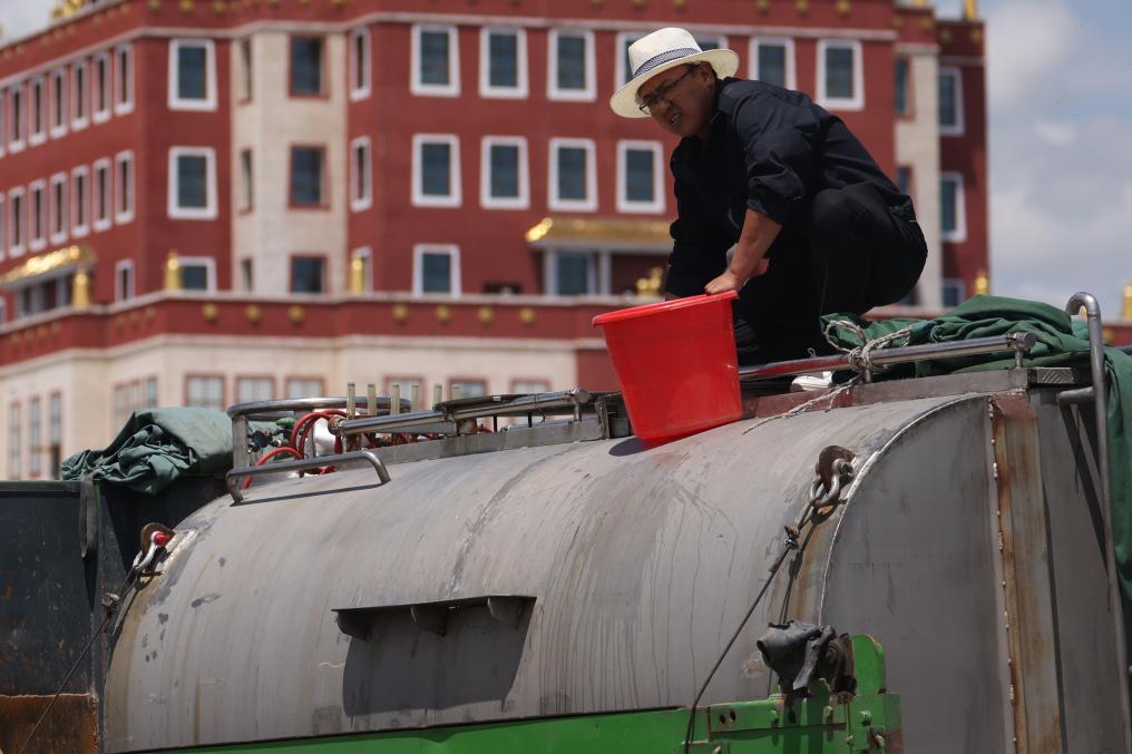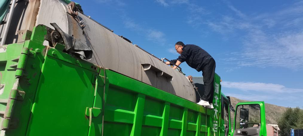 车辆进入一处服务区后,缓缓停靠在路边。李瑾翻身跳下车去,爬上4米多高的车顶,打开水箱盖细细查看,有几条小鱼在水面上游动着,似乎好奇地向外张望。