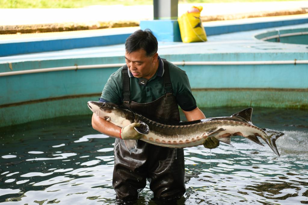 ↑周亮展示可用于增殖放流的长江鲟(6月27日摄)。