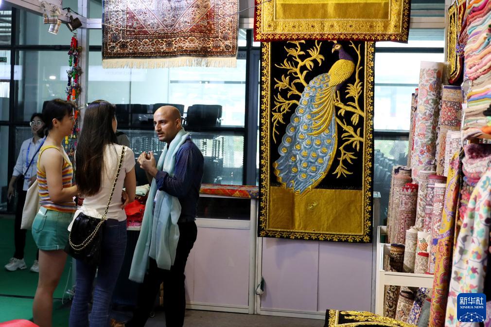 7月12日,一名来自巴基斯坦的展商(右)在展位与参观者交流。