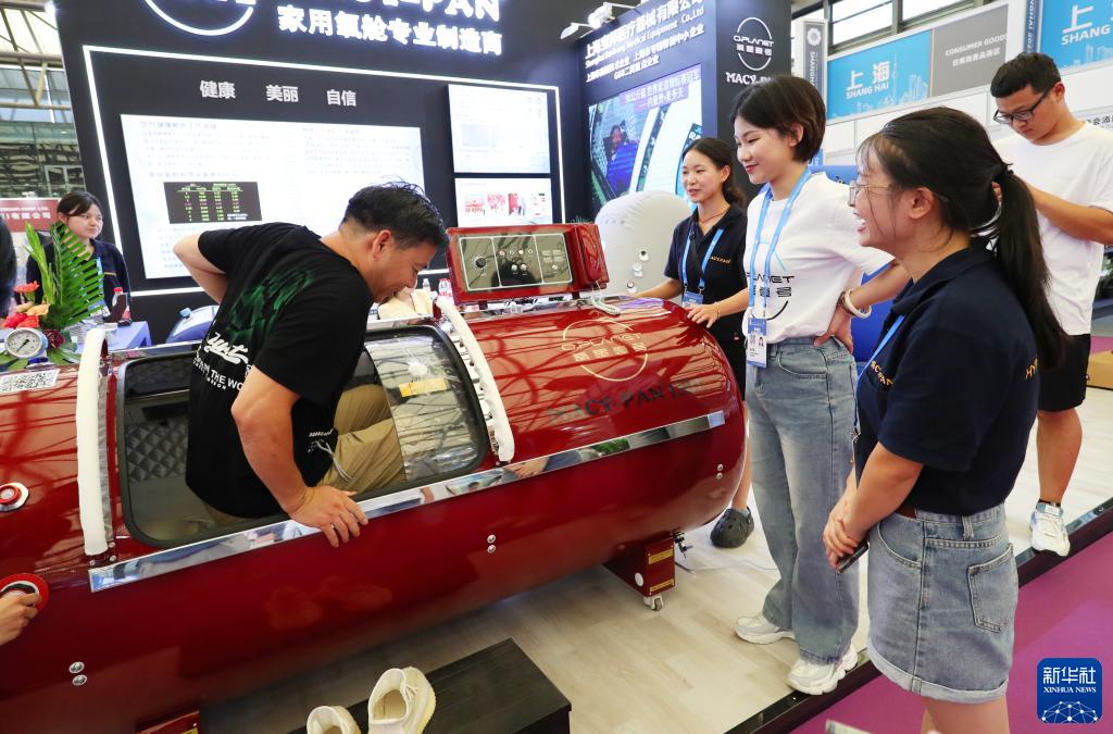 7月12日,一名参观者(左)在展会现场体验一款家用氧舱产品。