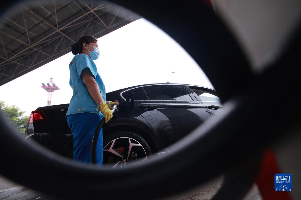 7月12日,河北省内丘县一家加油站的工作人员为汽车加油。