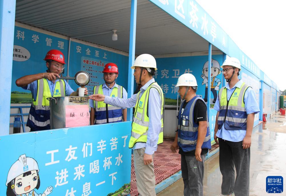 7月12日,中建二局合肥肥西产城融合安置点二期项目部工人在工地休息区茶水亭领取绿豆汤。