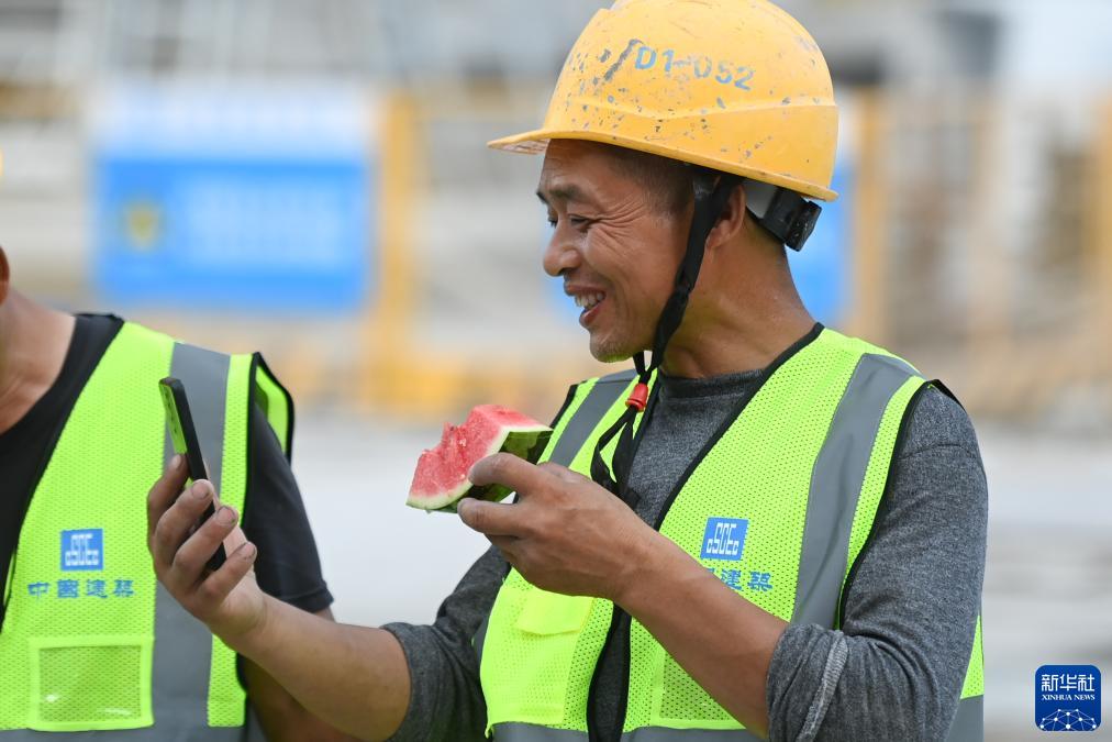 7月12日,中建四局浙江中医药大学附属第二医院中医药传承创新基地项目部的一名工人在休息站吃西瓜时与家人视频聊天。
