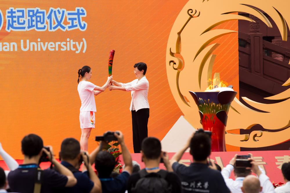 7月2日,第一棒火炬手吴敏霞(左)接过点燃的火炬。当日,成都第31届世界大学生夏季运动会火炬传递成都站起跑仪式在四川大学校园内举行。新华社发(曹鹏摄)