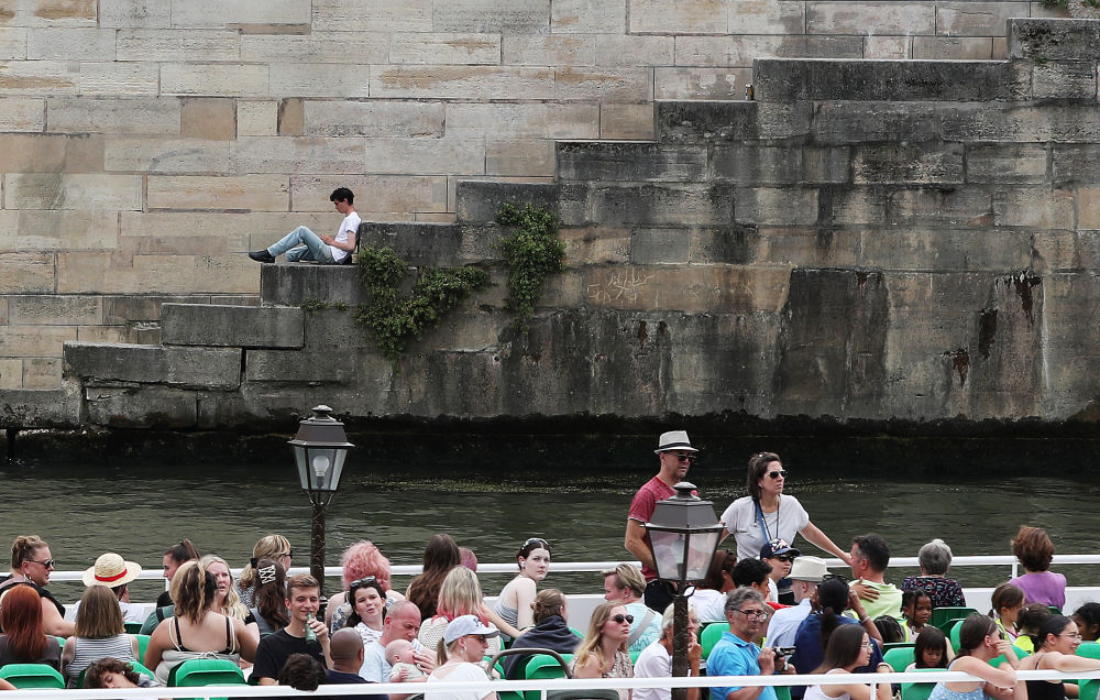 ↑人们参加巴黎塞纳河边举行的沙滩节。