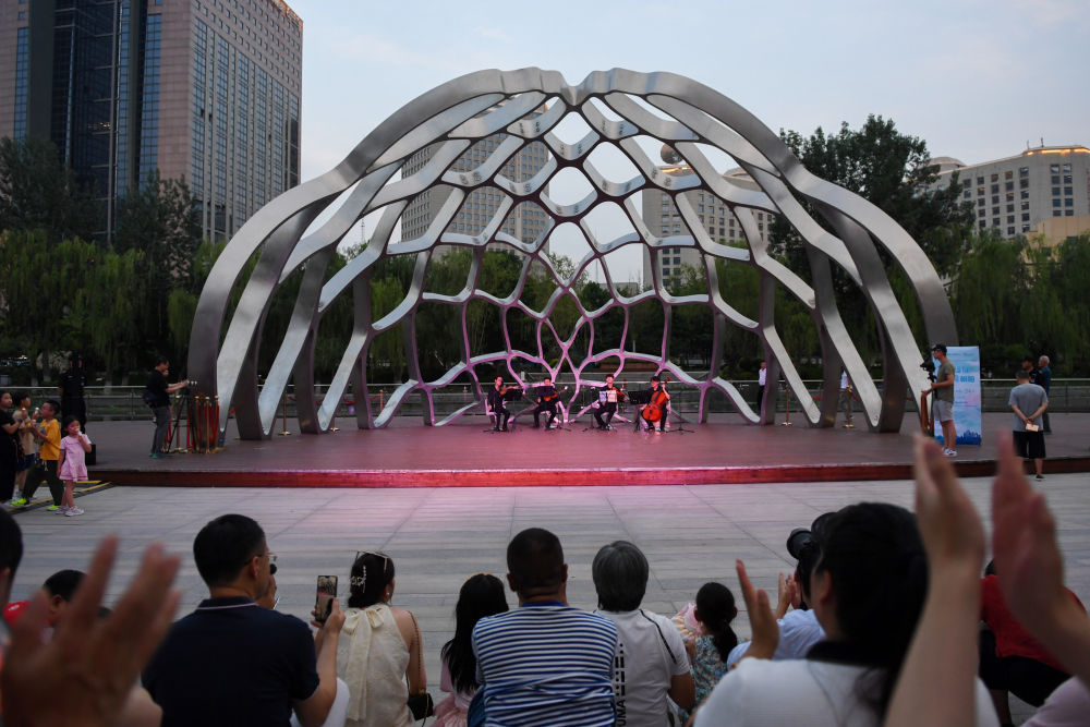 ↑人们在亮马河畔欣赏“亮马河艺术之夜”演出。