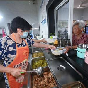 7月13日,老人们在湍口镇迎丰村老年食堂打饭。这个老年食堂的建设得益于新乡贤们的捐赠相助。