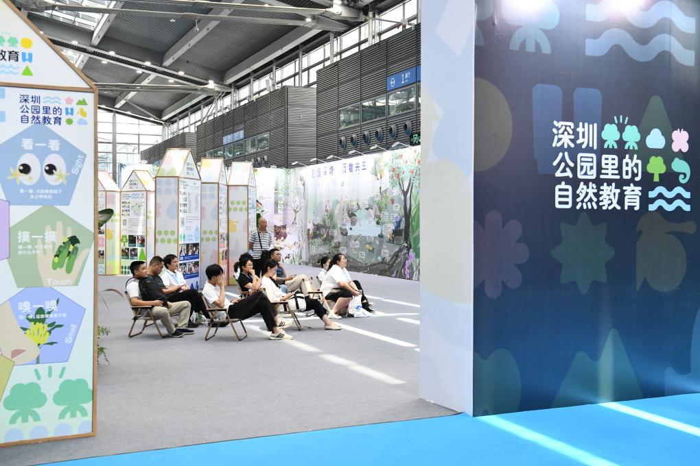 7月12日,观众在2023深圳(国际)城市环境与景观产业展览会现场观看自然教育影片。新华社记者梁旭 摄