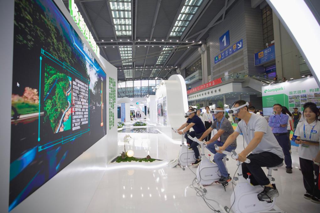 7月12日,观众在2023深圳(国际)城市环境与景观产业展览会现场体验VR“畅游”深圳绿道。新华社发