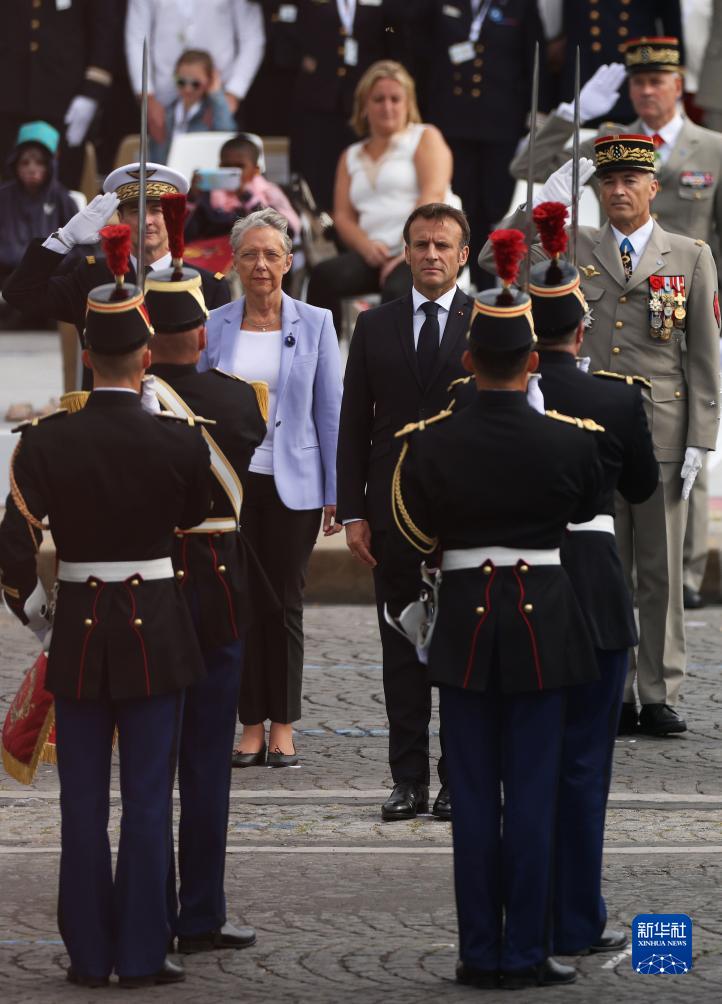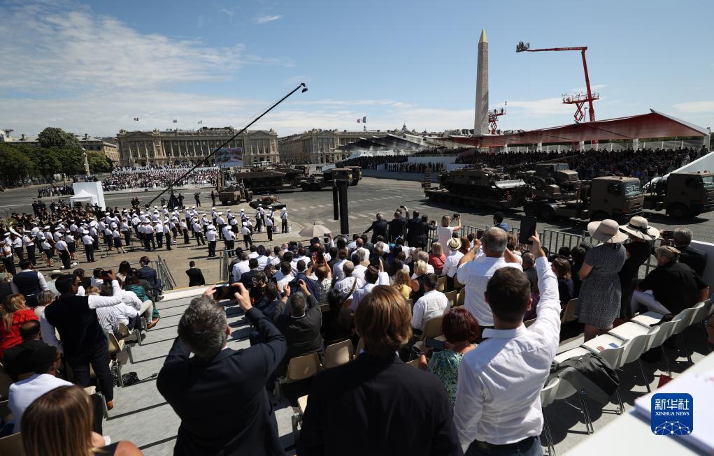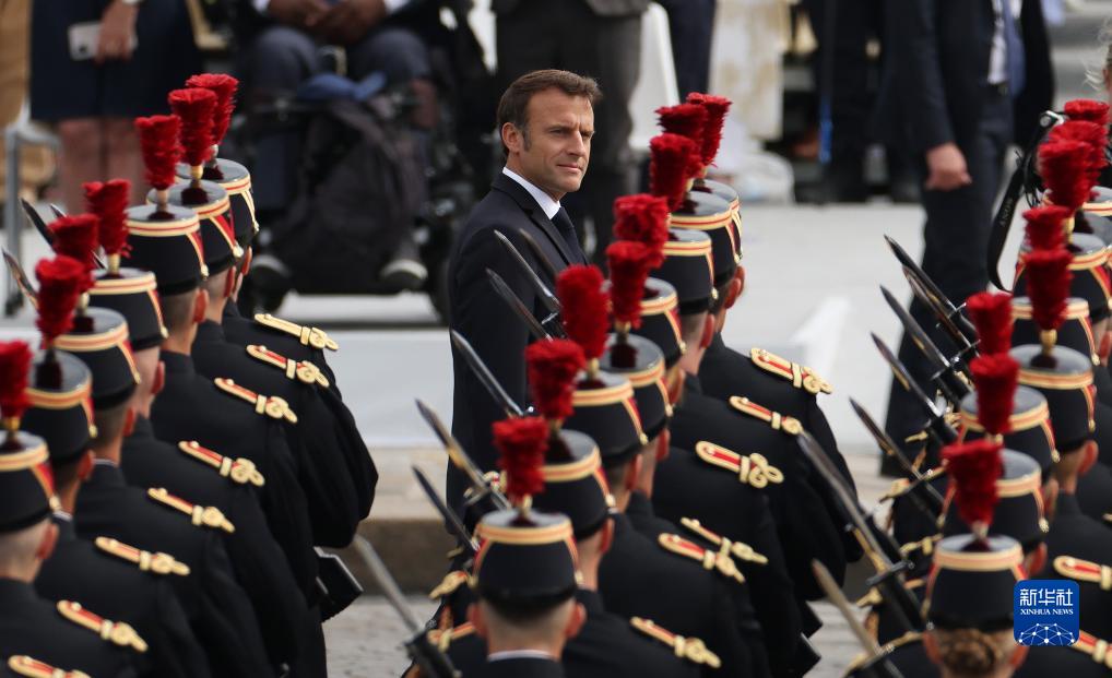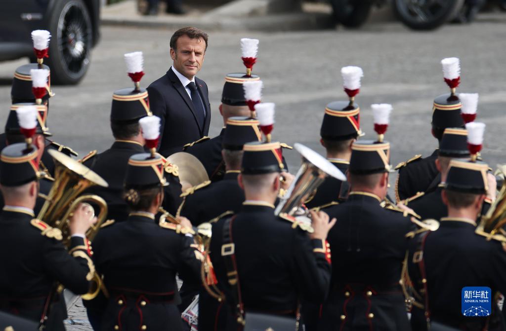 7月14日,法国总统马克龙在巴黎协和广场的国庆阅兵式现场检阅仪仗队。新华社记者 高静 摄