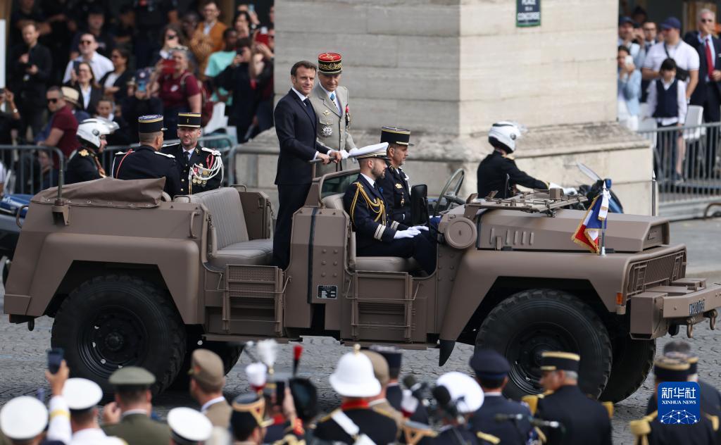 7月14日,法国总统马克龙抵达巴黎协和广场的国庆阅兵式现场。新华社记者 高静 摄