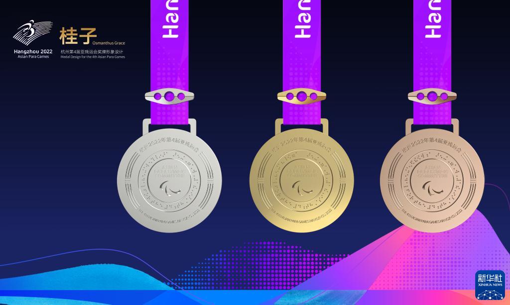 奖牌正面由桂花与杭州亚残运会会徽组合而成,背面则以亚残奥委会标志为中心环绕盲文,具有很高的辨识度,其中盲文的释义为:杭州第4届亚残运会金牌(银牌、铜牌)。