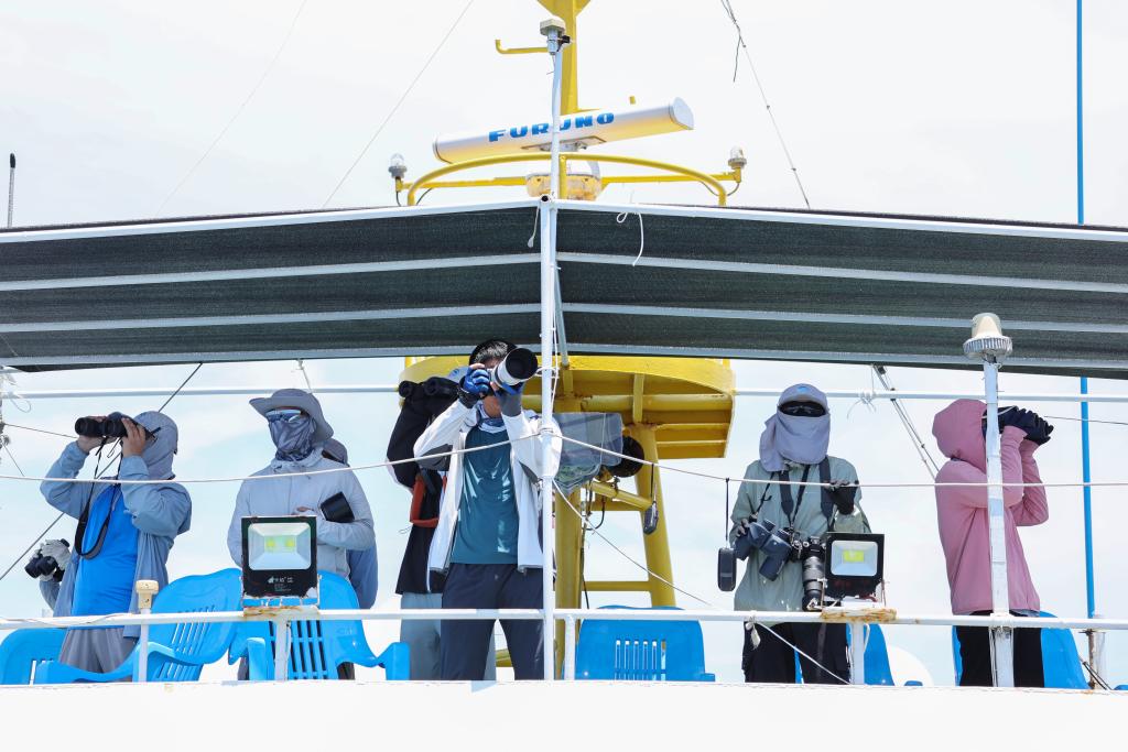 6月29日,第六次南海深潜及远海鲸类科考航次的科研人员在南海某海域进行目视观测。新华社记者张丽芸 摄