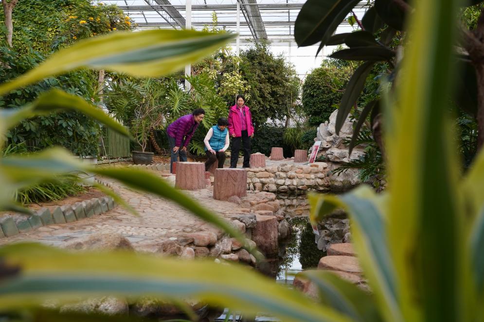 2月15日,三位老人在光年里康养度假中心的花园内观光。新华社记者杨世尧 摄
