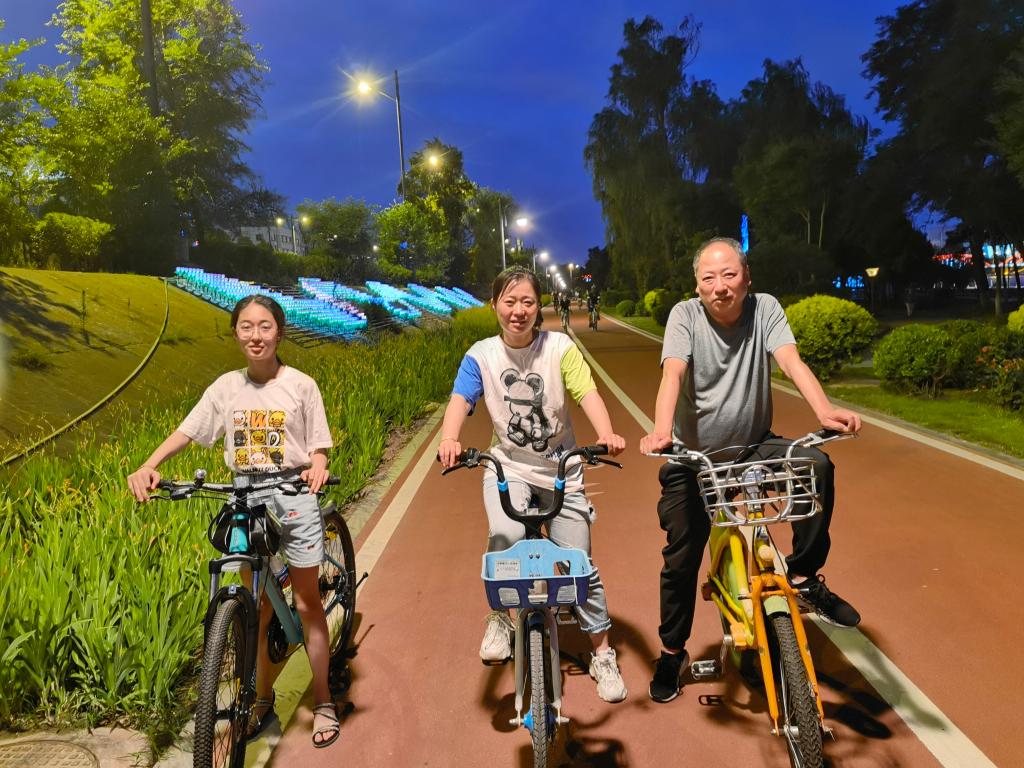 张燕一家在汾河公园夜骑合影。(张燕供图)