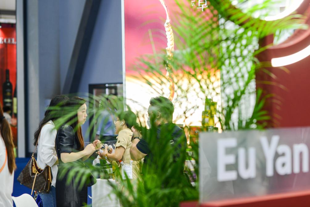 RCEP成员国企业亮相第三届消博会。2023年4月12日,参观者在新加坡企业余仁生的展台了解产品。新华社记者王泽聪摄