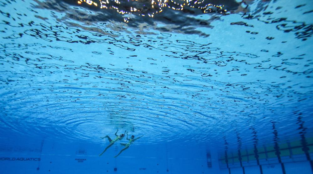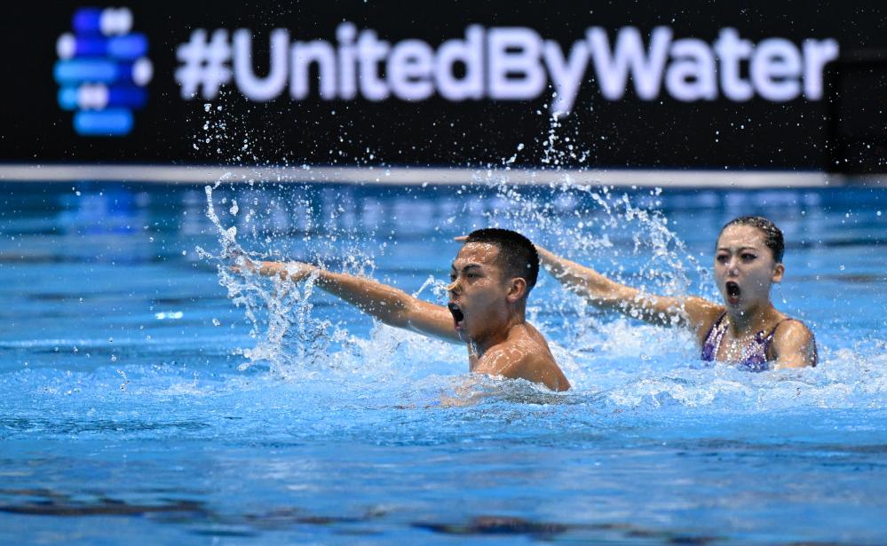 花样游泳混双技术自选决赛中,中国队的石浩玙/程文涛以《势不可挡》为主题的一套动作获得铜牌。日本组合佐藤友花/佐藤阳太郎获得冠军。