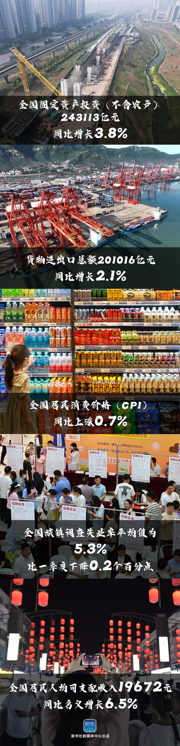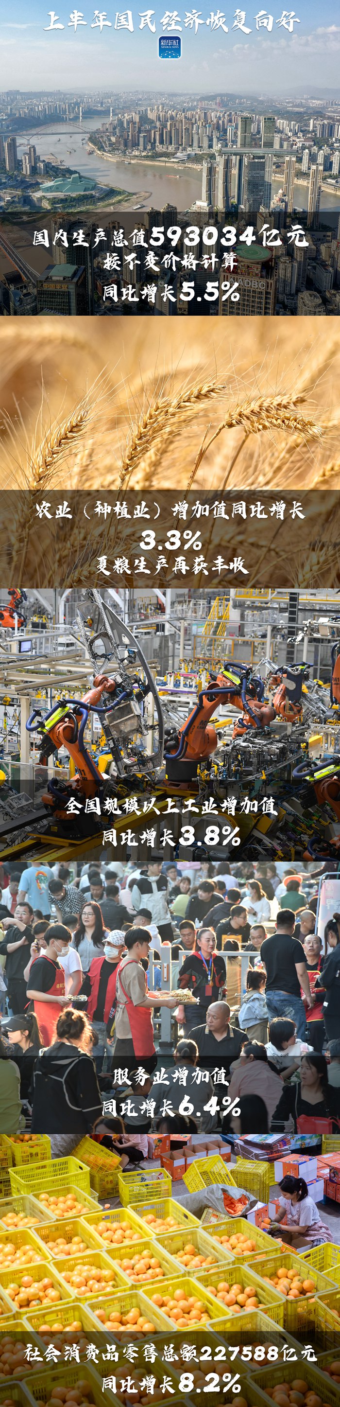 国家统计局7月17日发布数据,今年上半年国内生产总值(GDP)593034亿元,按不变价格计算,同比增长5.5%。上半年,面对复杂严峻的国际环境和艰巨繁重的国内改革发展稳定任务,各地区各部门突出做好稳增长、稳就业、稳物价工作,市场需求逐步恢复,生产供给持续增加,经济运行整体回升向好。