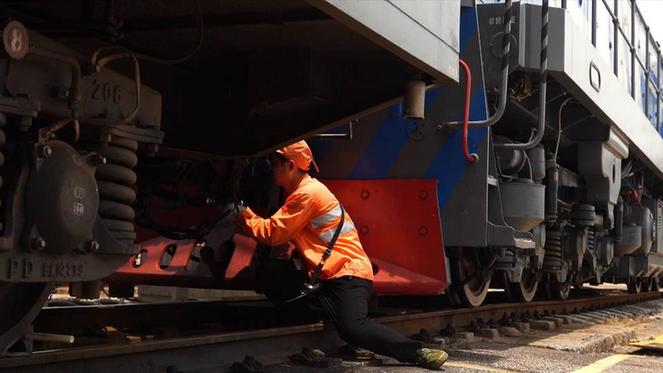 “轰隆”声渐近,一台蓝白相间的火车头在列车最后面,“推”着十几节车厢“倒着”缓缓驶进南昌客技站,列车停稳后,调车人员顶着烈日抓紧进行车厢编组作业。