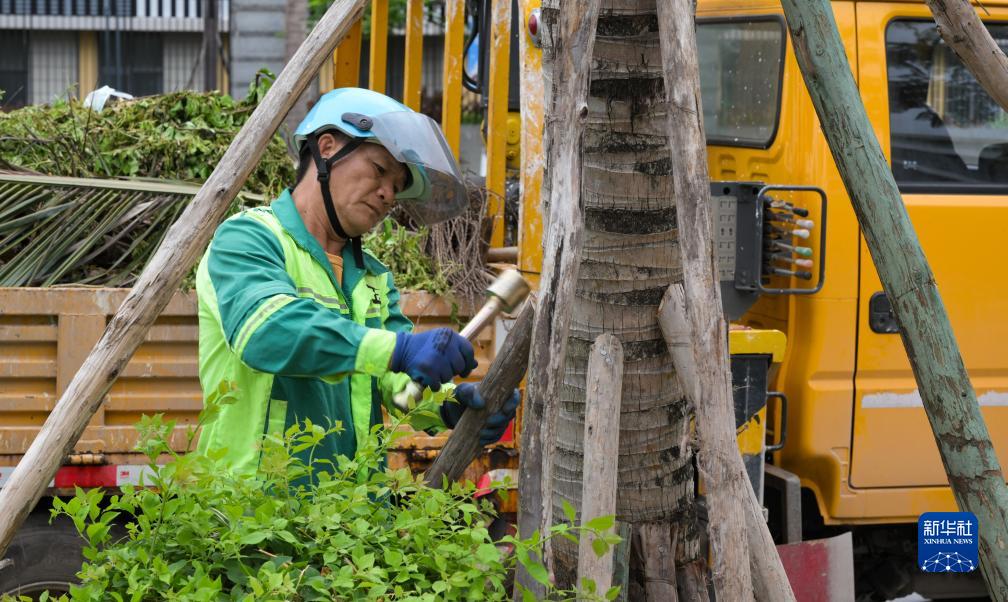 7月17日,在海口市新海大道,工作人员对树木进行加固。