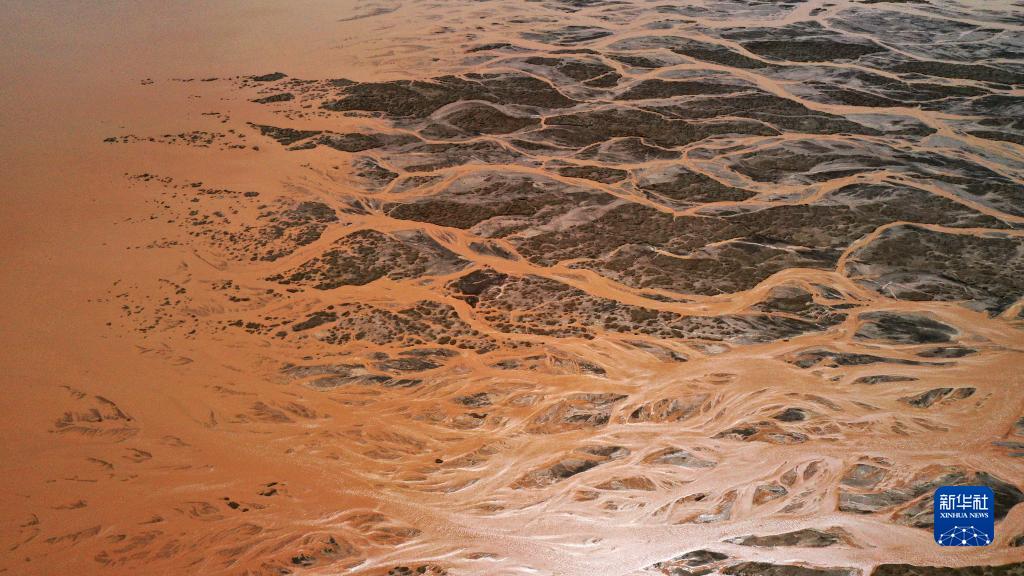 7月10日在新疆阿尔金山国家级自然保护区阿其克湖边拍摄的洪水冲刷下的河谷(无人机照片)。