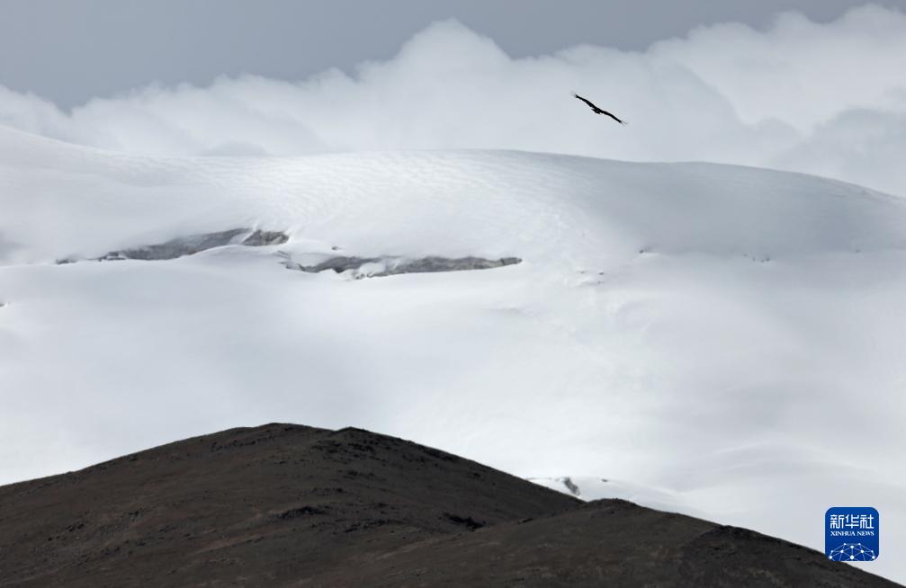 7月8日在新疆阿尔金山国家级自然保护区,一只秃鹫翱翔在木孜塔格峰上空。